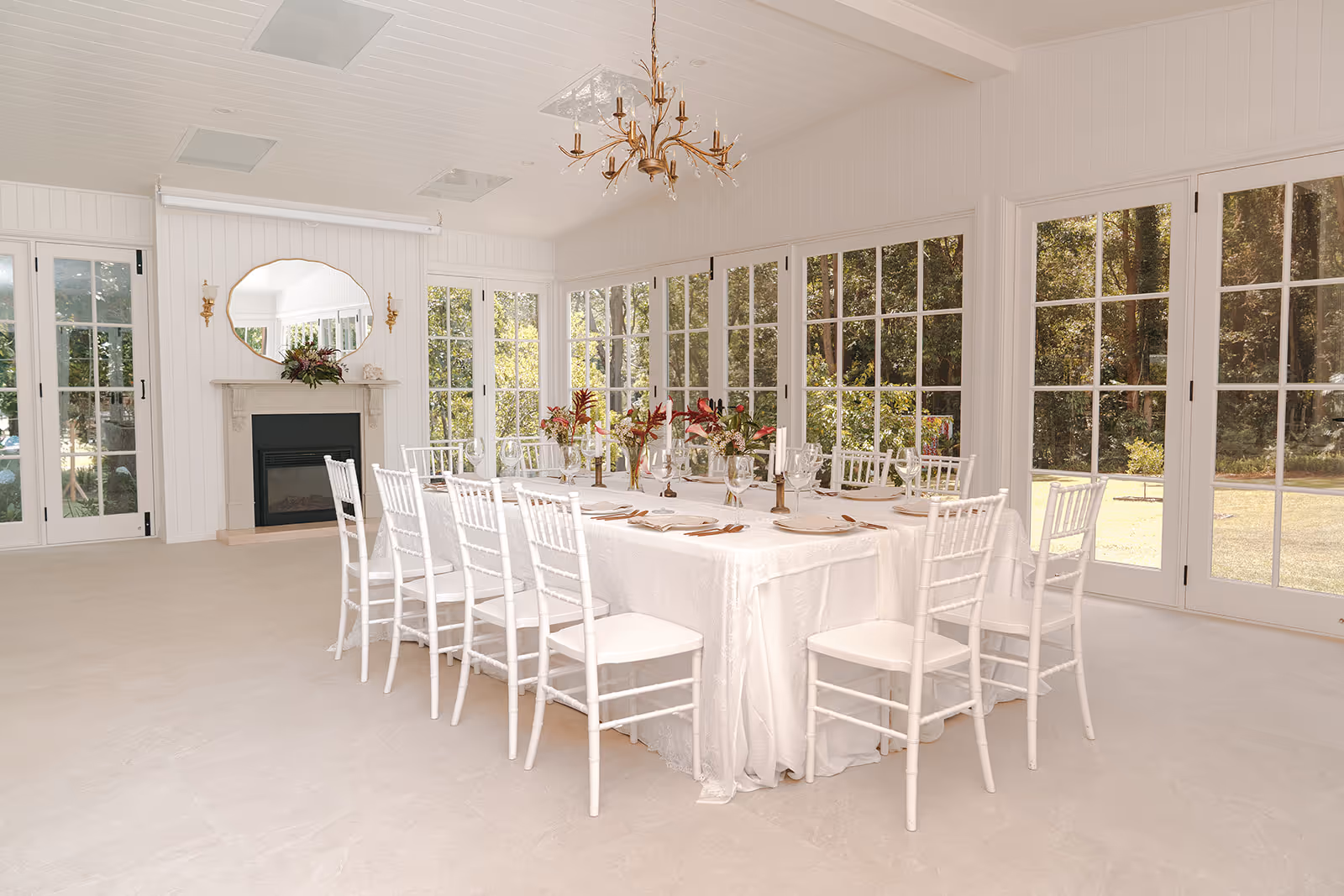 The french doors showcase the magnificent gardens. When the sun sets, the chandelier glows and the bastion lights twinkle through the glass, the Orangerie transforms into a sheltered candle-lit sanctuary to share a meal and dance the night away.